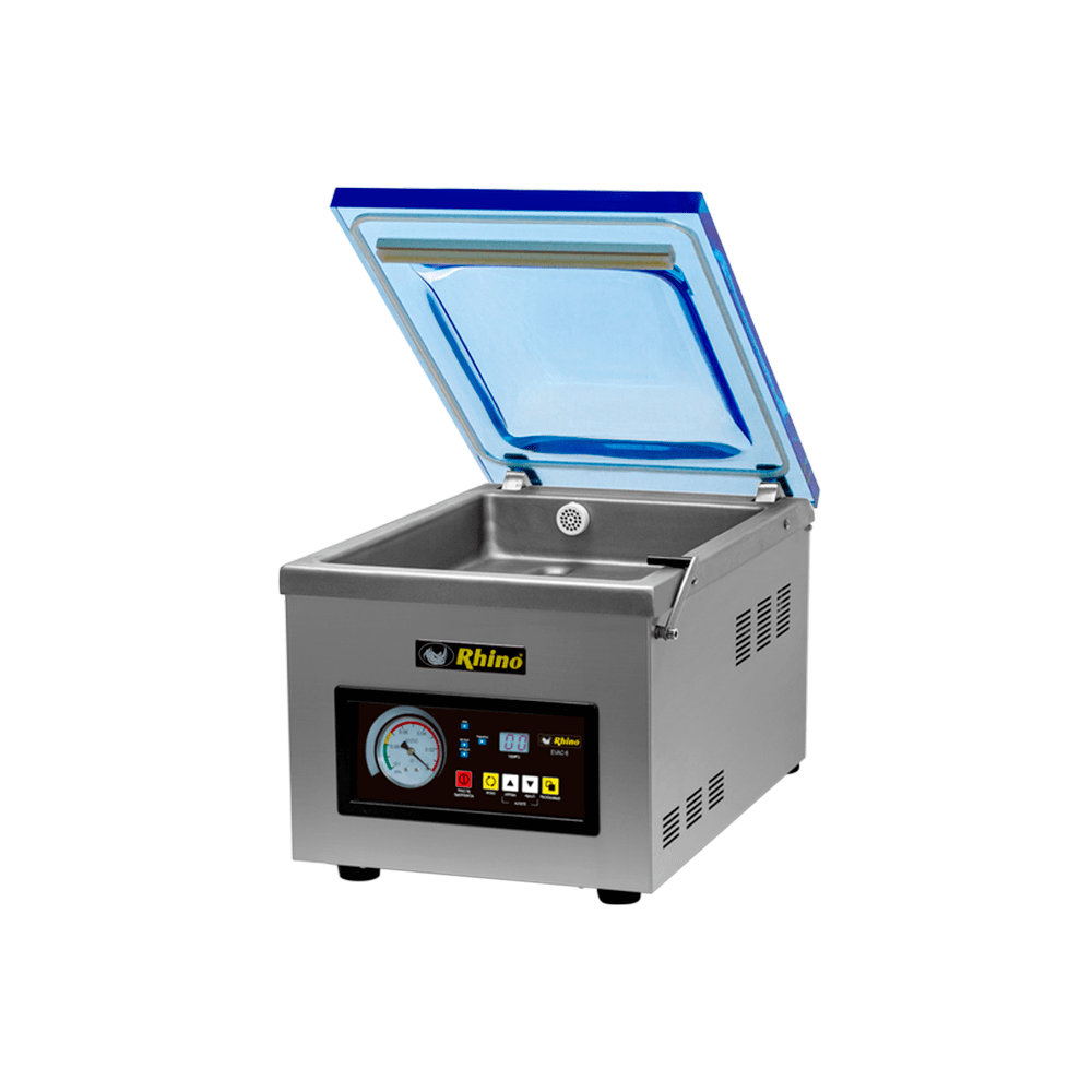 Empacadora al vacío Rhino EVAC-8 con bomba de 8 m³/h, barra de sellado de 27 cm y cámara de acero inoxidable. Cuenta con 5 ciclos preconfigurados y capacidad para empacar sólidos, líquidos y polvos. Ideal para extender la vida útil de los alimentos hasta 15 veces más.