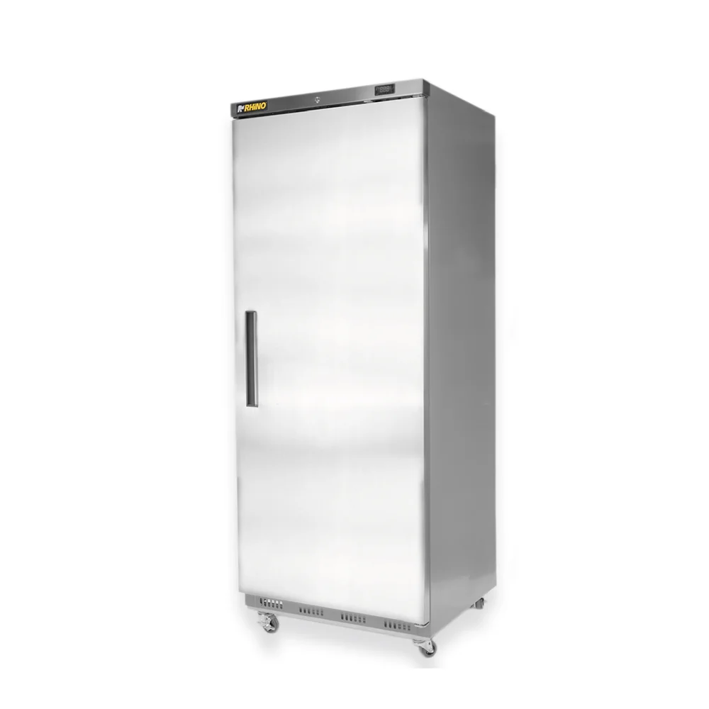 Conservador vertical Rhino de 23 pies cúbicos con puerta sólida, 4 parrillas internas y sistema de refrigeración por tiro forzado. Ideal para mantener congelados a temperaturas de -18 °C a -22 °C. Fabricado con materiales resistentes y diseño eficiente para uso comercial.