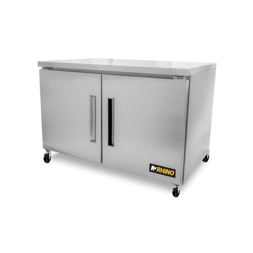 Mesa refrigerada bajo barra Rhino MERBAJ-48 con capacidad de 13.3 pies cúbicos. Fabricada en acero inoxidable, con sistema de enfriamiento forzado, control interno de temperatura y refrigerante ecológico R-290. Ideal para cocinas profesionales que requieren mayor capacidad de almacenamiento en frío.