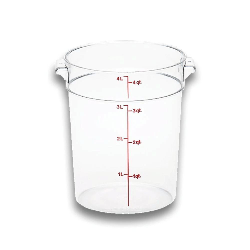 Recipiente redondo modelo REPORE-4 fabricado en policarbonato transparente de alta resistencia. Capacidad de 4 qt (3.78 L). Graduado en litros y cuartos. Apto para lavavajillas y libre de BPA.